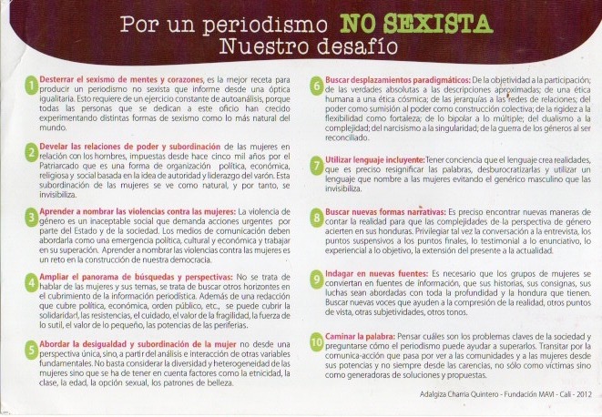 PC_POR UN PERIODISMO NO SEXISTA – AÑO 2012 19 enero, 2026 Por Federico Galvis Decálogo de periodismo con perspectiva de género. Deja una Respuesta Haz clic aquí para cancelar la respuesta. Nombre (obligatorio) Correo electrónico (no será publicado) (obligatorio) Sitio web Comentario