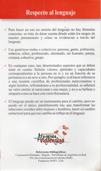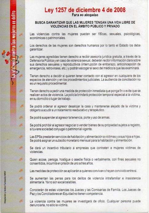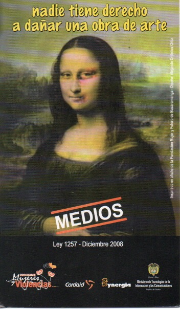 Una barra naranja con la palabra «MEDIOS» está superpuesta en el centro de la imagen. En la parte inferior, se hace referencia a la Ley 1257 de diciembre de 2008, junto con logotipos de varias organizaciones y el Ministerio de Tecnologías de la Información y las Comunicaciones. El cartel está inspirado en la Fundación Mujer y Futuro de Bucaramanga y diseñado por Alejandro Ordóñez Ortiz.