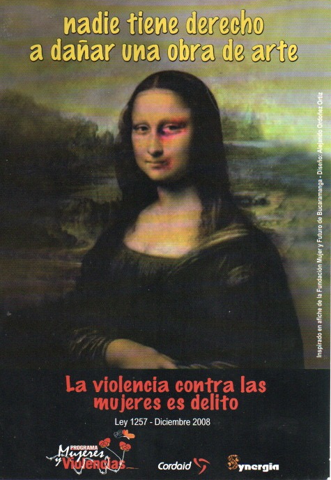La imagen es un cartel con una versión alterada de la Mona Lisa. Su rostro parece haber sido golpeado, con un ojo morado notable. Encima de la imagen, el texto declara «nadie tiene derecho a dañar una obra de arte».